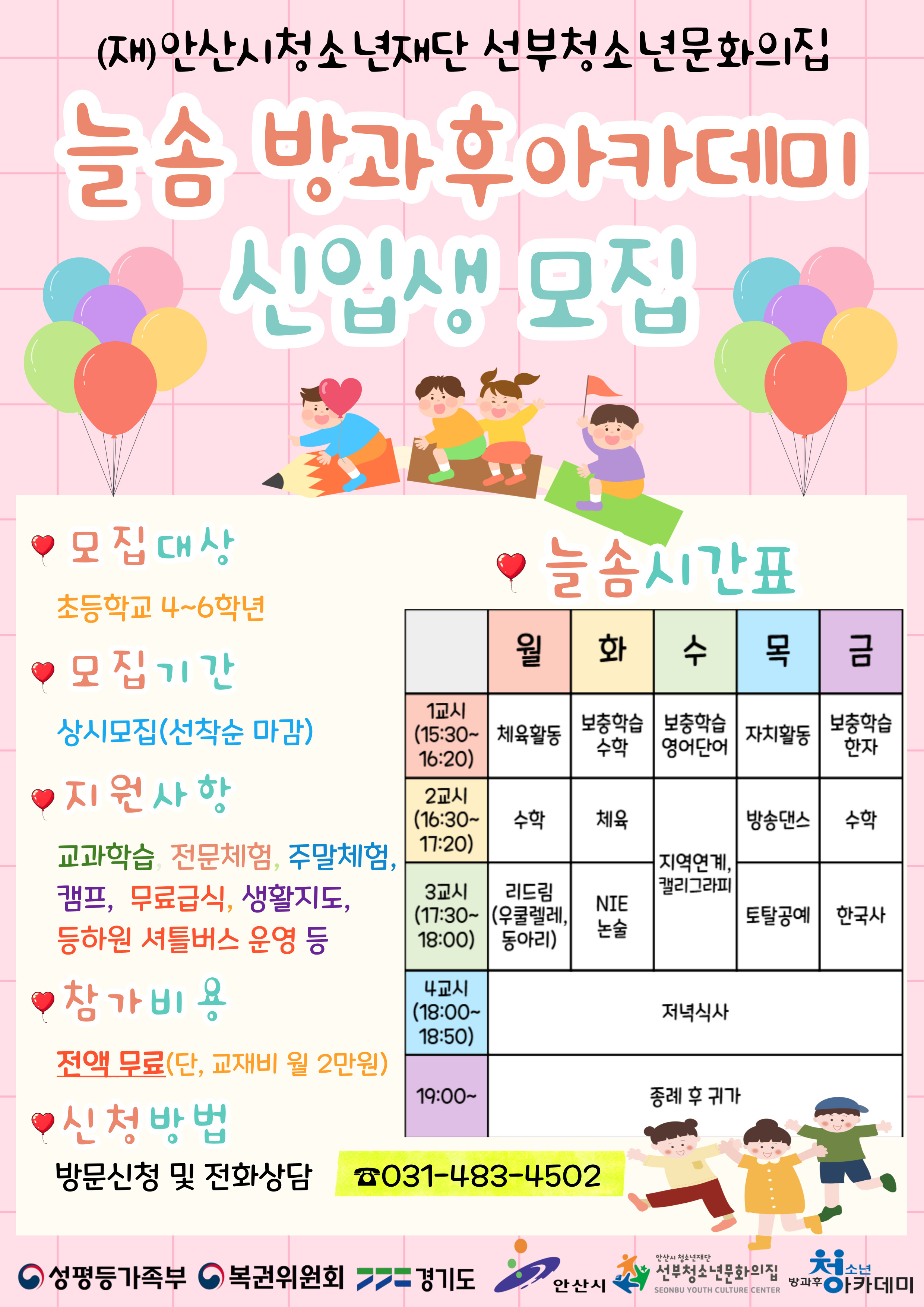 2026년 늘솜 청소년방과후아카데미 모집 안내 늘솜 방과후아카데미 참여하고 싶은 청소년들을 위해 신청서 양식을 공유하고자 합니다. 선부청소년문화의집 3층 기관 방문을 통하여 접수받습니다. 아래 한글 파일 다운로드 후 작성하시고 가지고 오셔도 되고, 오셔서 작성하셔도 됩니다. 031-483-4502 로 문의 전화 주시기 바랍니다. ① 2026 방카 지원신청서 : https://drive.google.com/file/d/1MBc2owsPAJVQ6DKuSTq4WgwxtWL5Gm_R/view?usp=sharing ② 안산시 통합 예약 시스템 가입 안내 안산시 통합 예약 시스템이 신설됨에 따라, 산하기관에서 수강하는 학생들의 경우 청소년 명의 회원가입이 필수입니다. https://reserve.ansan.go.kr 사이트에서 꼭!!! 반드시 학생 이름으로 가입해주시기 바랍니다. ③ 정상가입 확인을 위하여 구글폼 설문에 응답하여 주시기 바랍니다. https://forms.gle/MMYNysaAtW22m9Hj6 ▣ 활동사진 : https://seonbu.ansanyouth.or.kr/sub04/sub04.php 감사합니다.