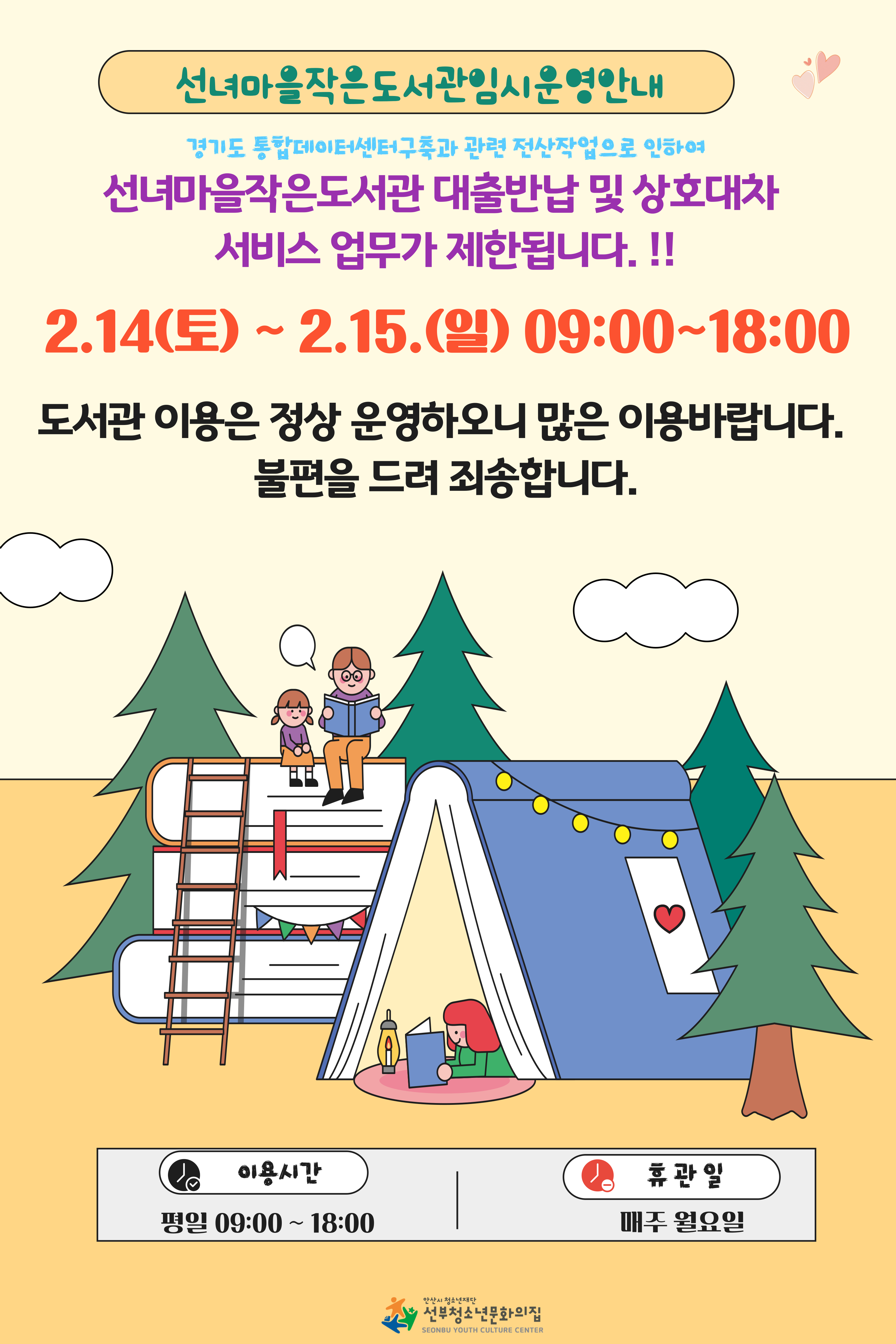 [선녀마을작은도서관] 대출반납 및 상호대차 서비스 제한(2.14.(토) ~ 2. 15.(일) )